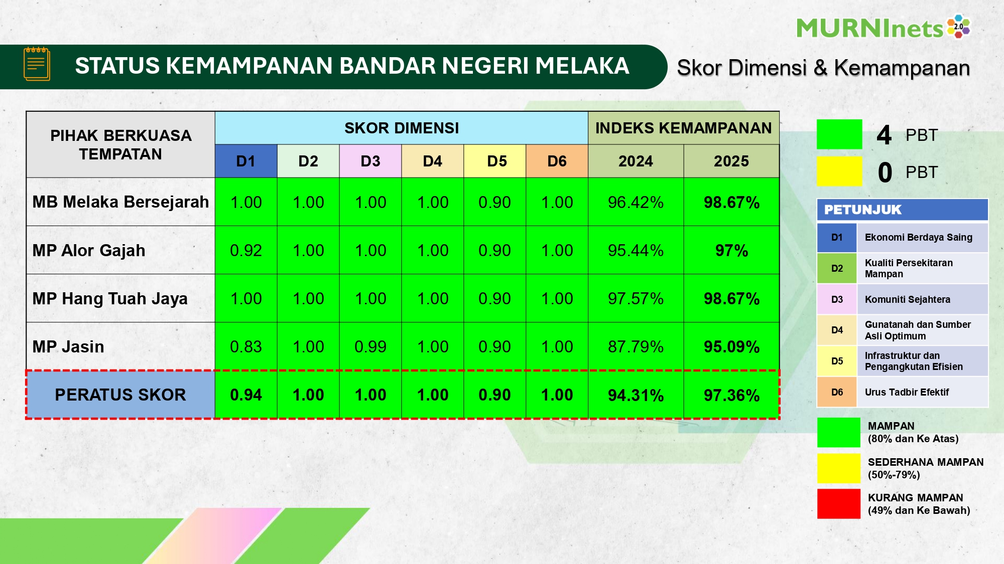 - Pelaksanaan MURNInets yang dilaksanakan oleh JPBDSM adalah melibatkan bandar-bandar utama dengan menggunapakai 38 indikator.